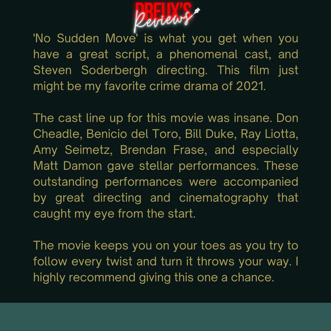 . In the new No Sudden Move trailer Don Cheadle and Benicio del Toro join a group of small-time criminals hired to babysit a mans family while he picks up a. Curtis Goynes Cheadle walks into a brown room with yellow lighting and agrees to a gig thatll give him 2000 now and 3000 when its done. Ad Choose your plan.
